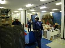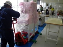 こちらの事例は眼鏡製造施設の移転作業で、ビルの1F、3F、BFから搬出し、新施設の3Fに2日間で搬入出した事例です。お客様の業務が大変好調で移転に割ける時間が少なく棚や机等の書類、眼鏡のレンズやフレームなどはお客様に梱包・棚入れ戴きました。一番の難関は通路幅一杯の機器搬出(クリアランスが両側で5mm程度)でしたが、搬入も以前弊社にご依頼頂いておりましたので、作業はスムーズに行えました。