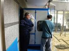 ⑥ 大型の精密機器搬出。壁面と機器のクリアランスが両側で5mm程度しかなく、エアキャップ(プチプチ)などの梱包が出来ないためベテラン作業員数人による連携プレーが必至です