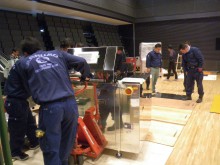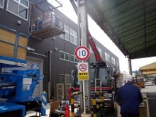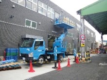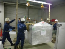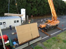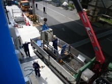 こちらの事例はメーカー様検査室の移転作業で、工場の1F・3Fから搬出し、同サイト内の新施設2Fに3日間で搬入出した事例です。物量はそれほど多くありませんでしたが、新施設搬入口が2F食堂に設けられた小さいシャッターのみでした。その為クレーン及びゴンドラを使用しての搬入ではロスが大きく、スカイデッキ(最大積載量1000kgの高所作業車)を使用してスピーディーに搬入を行ったのが本件の特徴です。